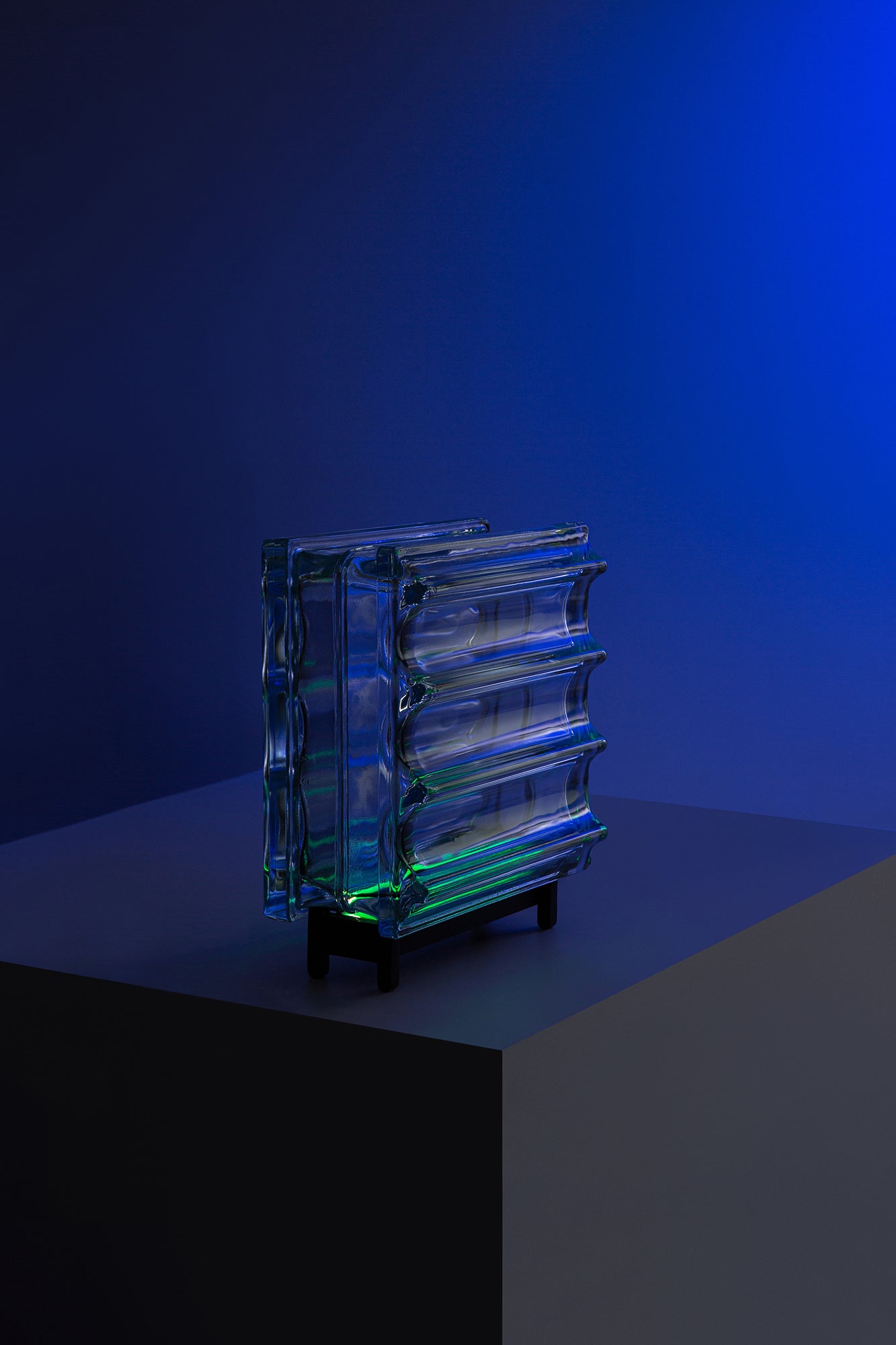 Vintage Line's dimmable table lamps are made using original glass blocks from the 1970s and 1980s which were highly popular in the postmodernist architecture.