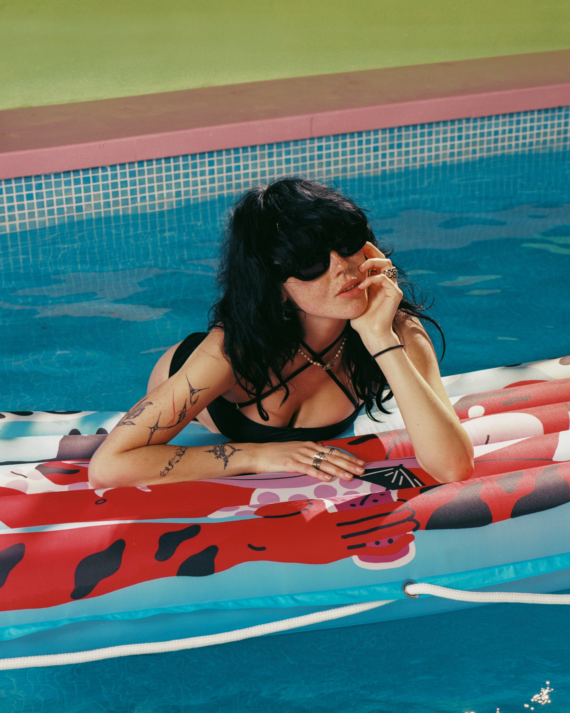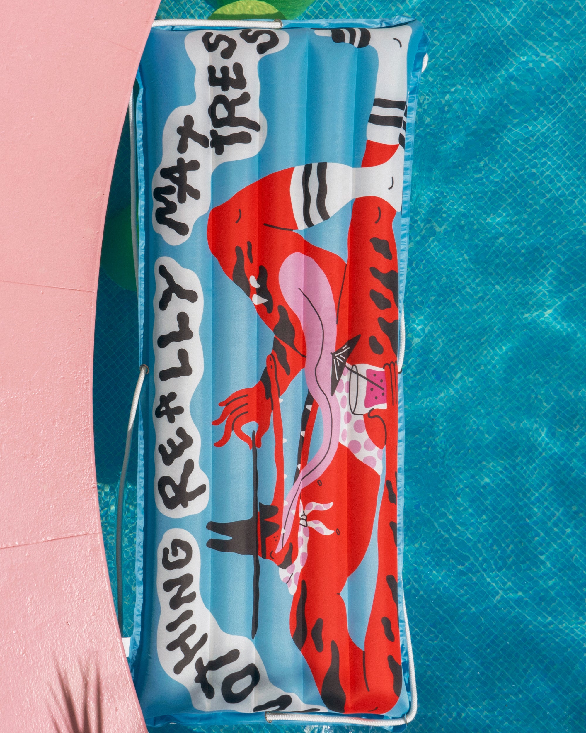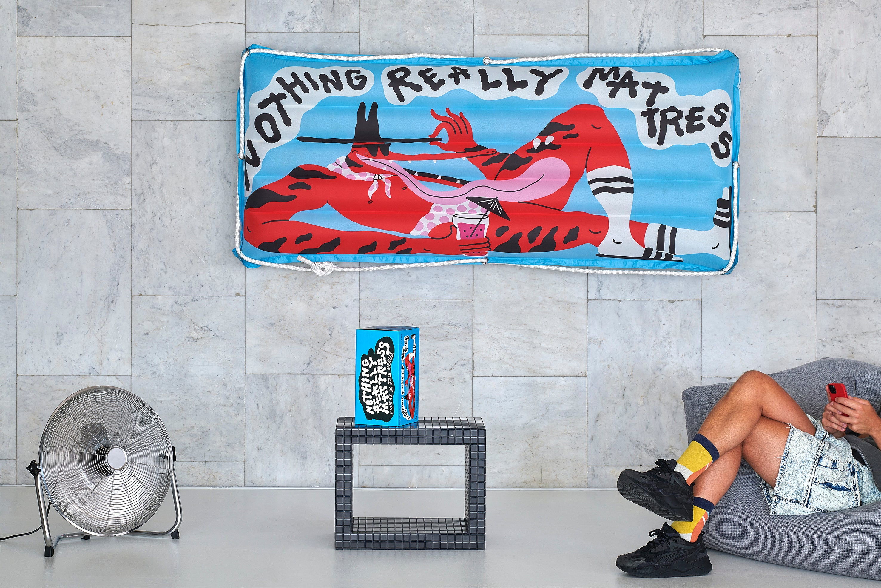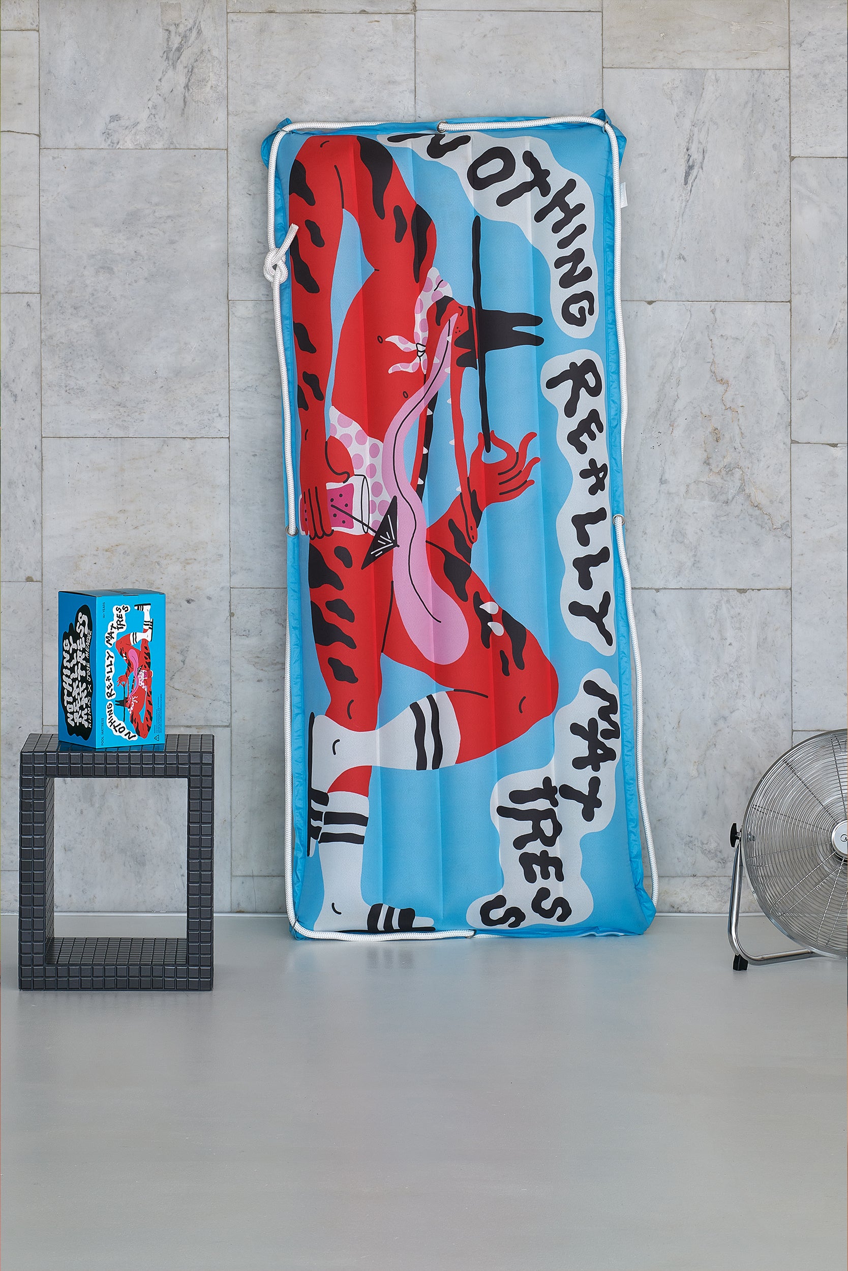 The inflatable double-layer 'Nothing Really Mattress' is made of Pongee fabric, which is known for its smooth and silky texture. Due to these surface properties, it's not only pleasant to touch and rest on the mattress, but it also ensures a very high-quality and vivid illustration print.